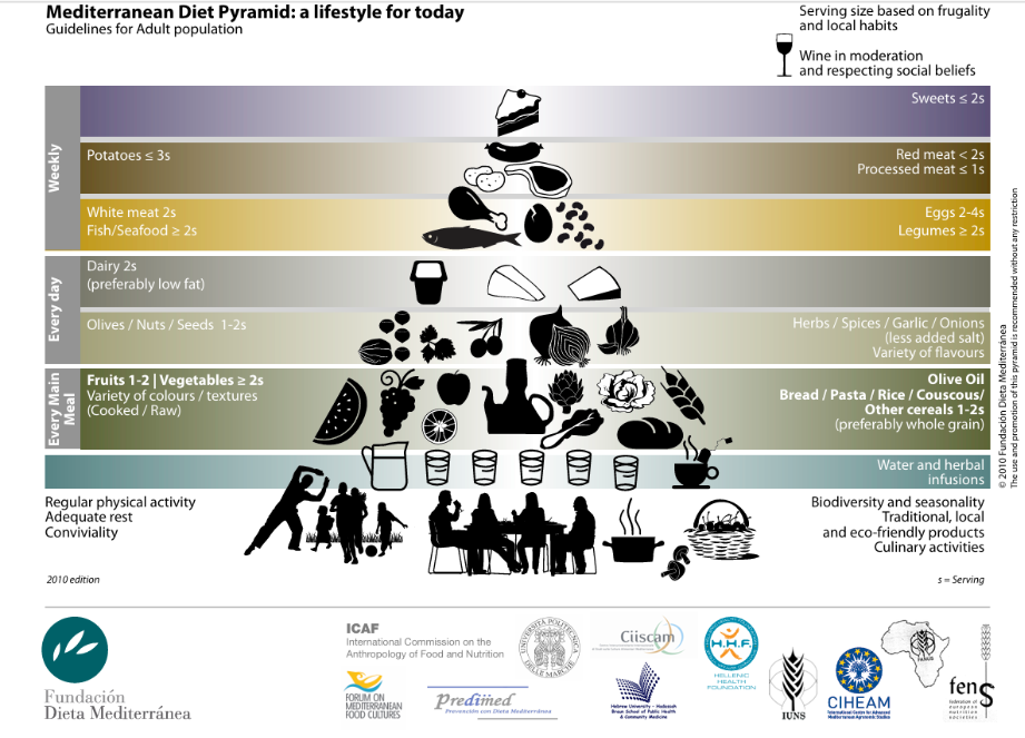 In the illustration below, the core principles of the Mediterranean diet are presented. This graphic can be used for educational purposes when working with clients and can be downloaded from the following website: https://dietamediterranea.com/en/nutrition/
